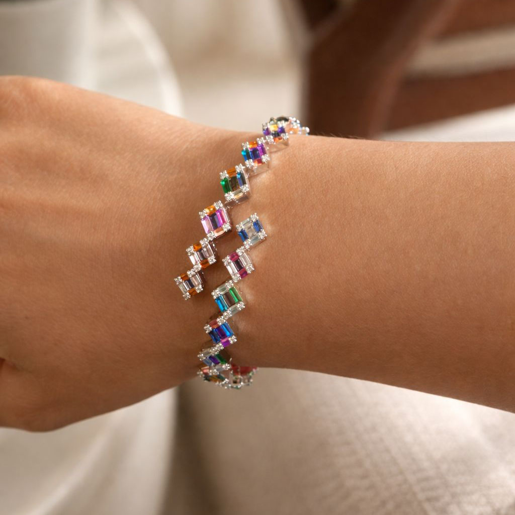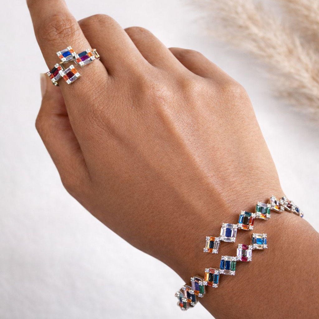 Elevate your style with this vibrant multi-color gemstone jewelry set, designed to add a bold yet elegant touch to any look. Featuring a beautifully crafted bracelet and matching open ring, each piece showcases a stunning arrangement of baguette-cut stones in a spectrum of radiant hues. The colorful gemstones are meticulously set in a sleek silver-tone finish, creating a modern geometric design that catches the light from every angle.