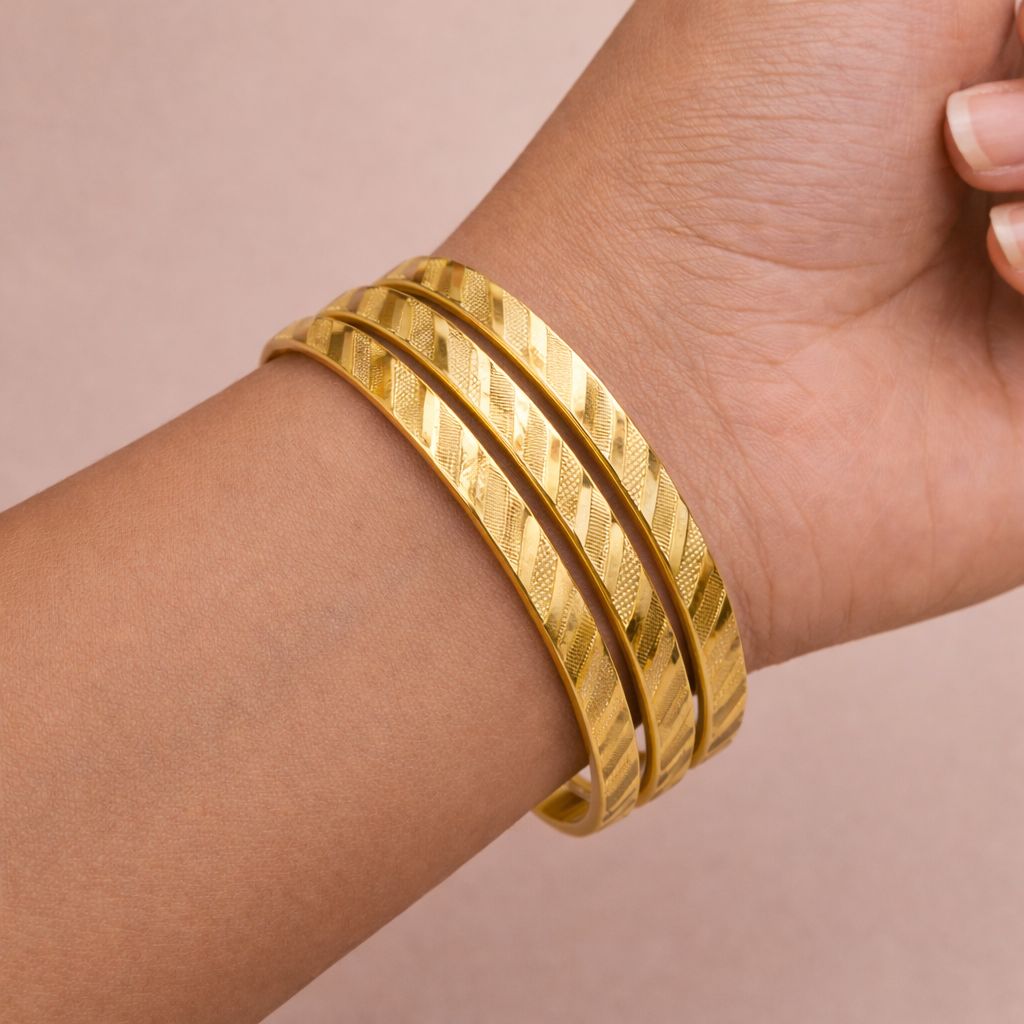 A statement of quiet sophistication, the Golden Grace Bangles – Dual Edition embody timeless elegance with a contemporary edge. Designed in a sleek, slender silhouette, this exquisite pair features precision-cut diagonal textures that catch the light beautifully, creating a radiant interplay of shine and depth.