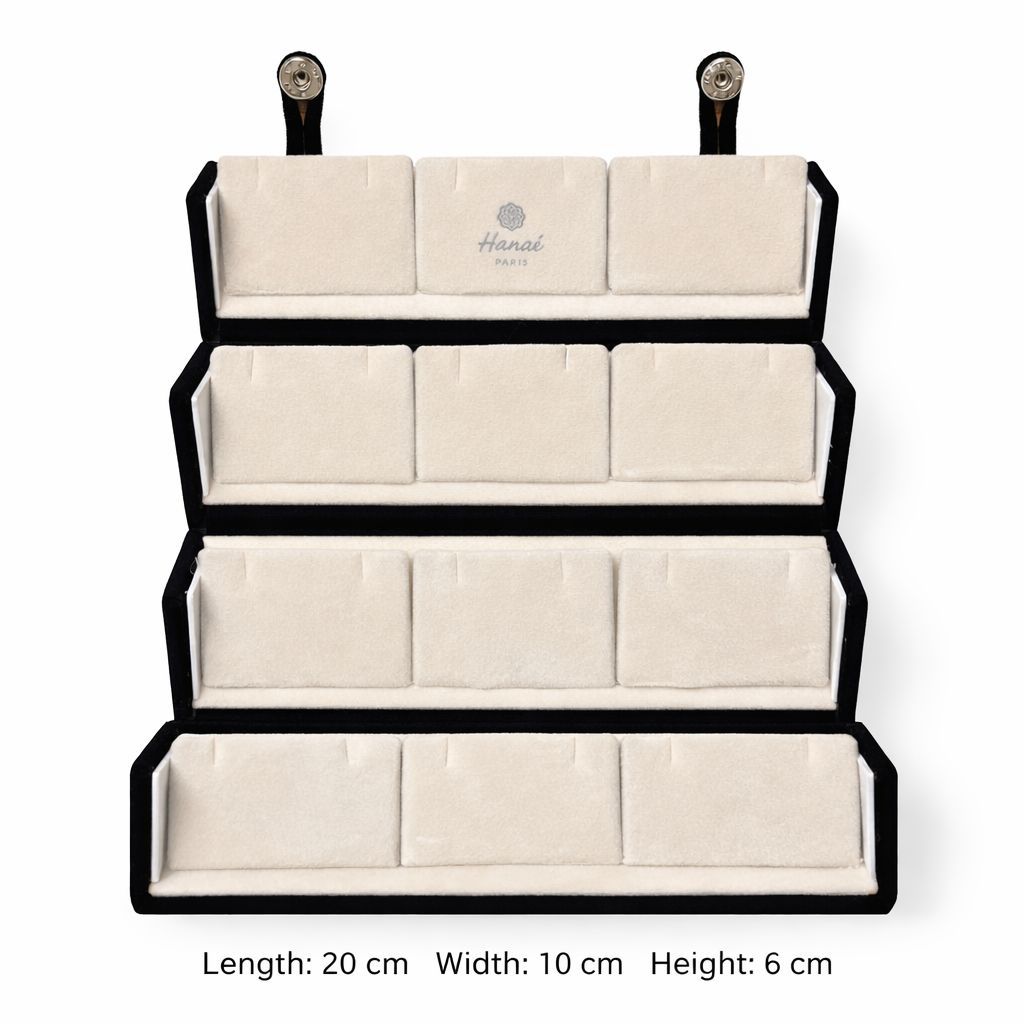 Crafted for the modern woman who treasures her sparkle, the Hanaé Éclat Earring Vault is a statement of refined luxury and thoughtful design. Wrapped in rich noir velvet with a soft cream suede interior, this multi-tier case is designed to protect and present your earrings with timeless sophistication.