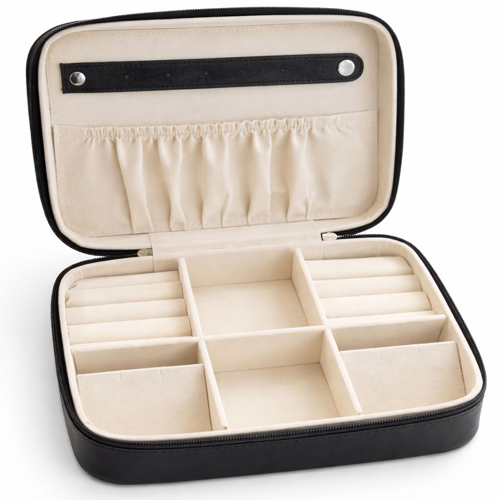 The secure zipper closure ensures your valuables stay safe, while the structured design helps maintain the case’s shape. Perfect for travel or everyday organization, this jewelry box keeps your collection neatly arranged and easily accessible.